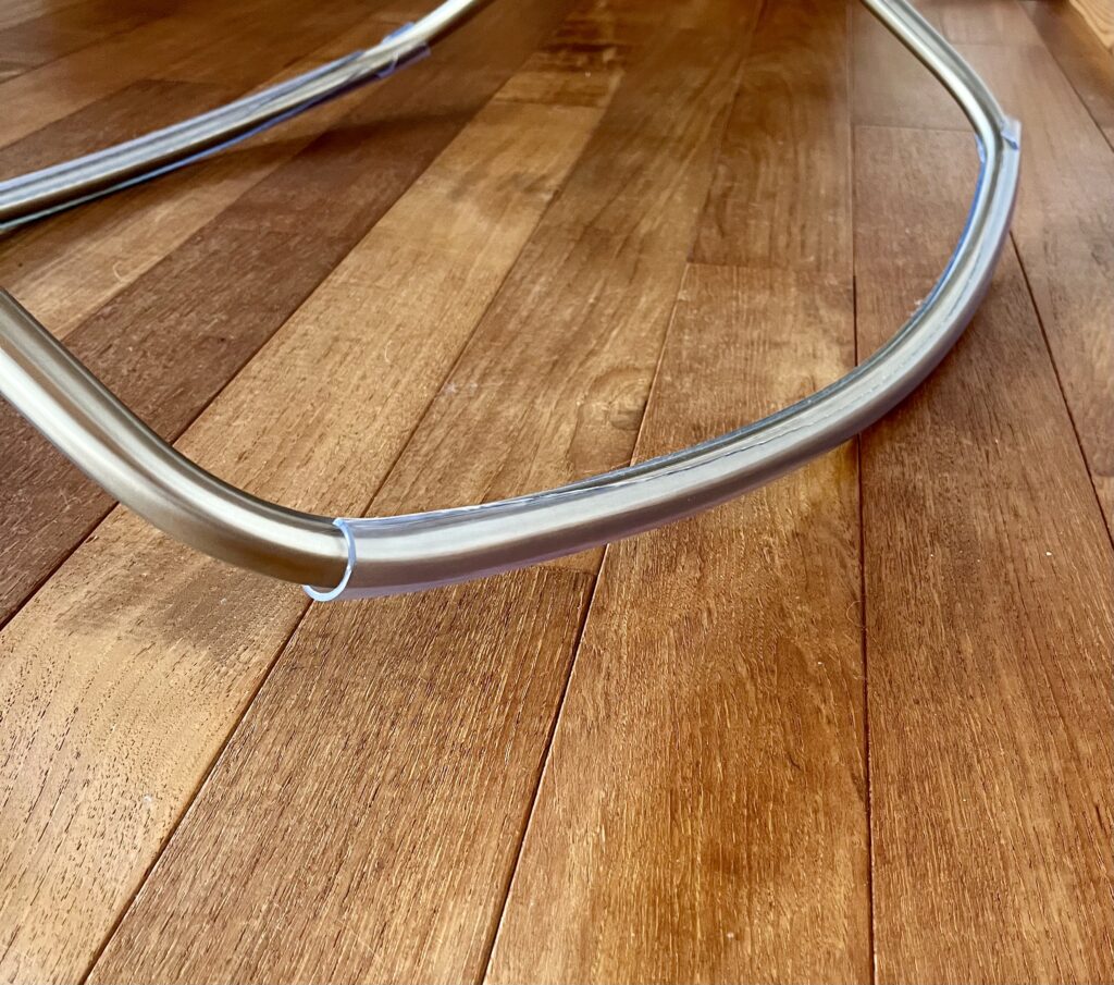そして、床に触れる脚部分に、傷防止として透明チューブを装着しました。これは、インテリアショップの店員さんが教えてくれた方法です。心配なら、椅子の下に敷物を敷くのもおすすめだとのこと。