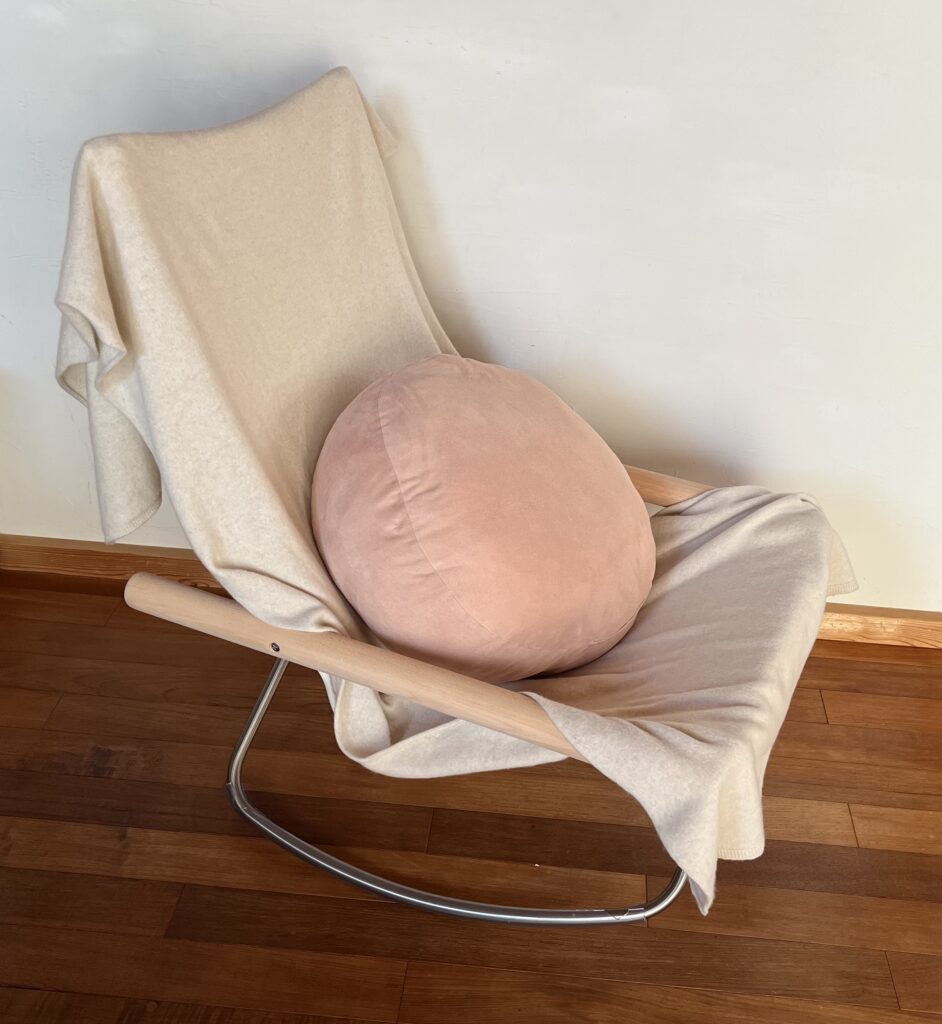 さらに、寒い季節になったら、ウール素材の大きめ膝掛けを、椅子全体に掛けて使用しています。何年も前に購入した薄いカシミヤの膝掛けが、サイズ的にピッタリでした。